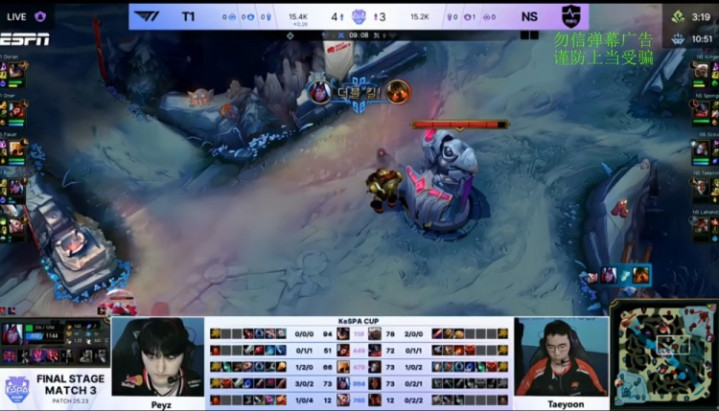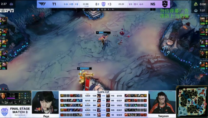 [22:41]厄塔汗团战,Lehends泰坦钩人开团但队友没有到场,Keria洛开大进场,Oner瞬间双杀,Taeyoon希维尔反手双杀,多兰补掉Scout发条,T1打出2换5团灭NS后吃掉厄塔汗,经济领先1k。
