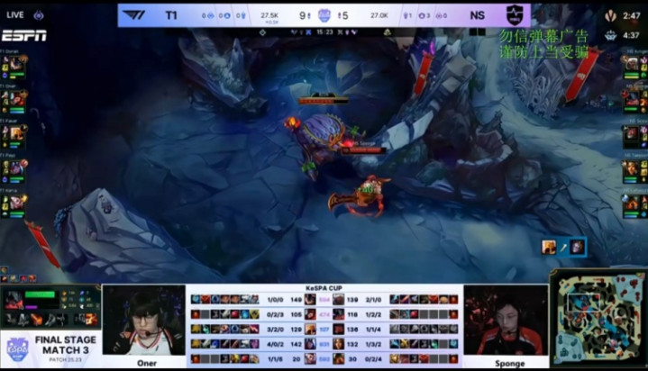 [24:42]Kingen安蓓萨下路被T1三人逮捕,Sponge剑魔自家野区被打出闪现,双方拉开。