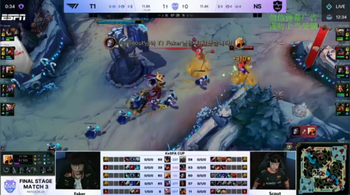 [11:25]Faker沙皇来上推回Kingen安蓓萨,联手Oner猴子将其击杀,同时下路Sponge剑魔下路被抓,Taeyoon希维尔中路再送一个,战绩来到0-3-1。